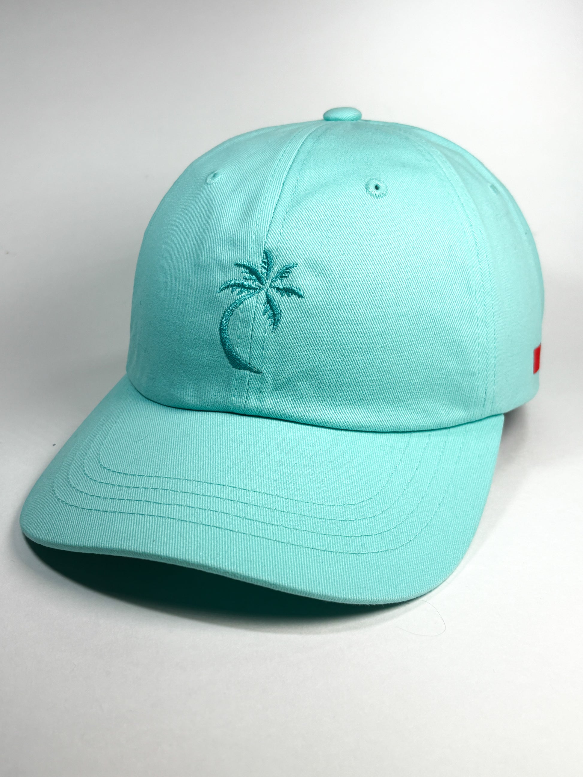 Flexfit adjustable dad cap in teal with embroidered single palm design in teal.